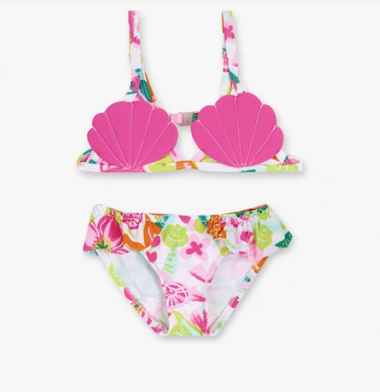 Bikini con estampado floral de colores y aplique de conchas fucsia en el top para niña. Colección Seashell.