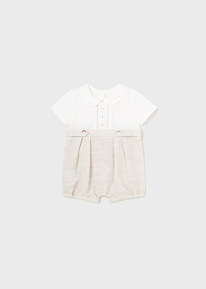 Pelele de manga corta para recién nacido. Cierre con botones en la espalda para facilitar la puesta de la prenda. Tejido de aspecto fresco y actual con lino.