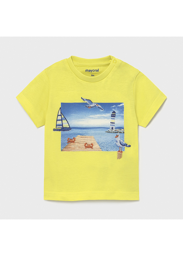 Prenda ECOFRIEND 100% algodón sostenible. Camiseta de manga corta para bebé niño. Cuello redondo. Cierre con un único botón en el escote delantero. Tejido 100% algodón. Elementos de adorno: dibujo en la parte delantera.