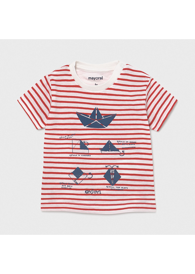 Camiseta de manga corta para bebé niño. Cuello redondo en distinto color. Modelo de corte recto. Cierre con botones a presión en el hombro para facilitar la puesta de la prenda. Cómodo tejido de punto. Elementos de adorno: dibujo en la parte delantera. Motivo de rayas.